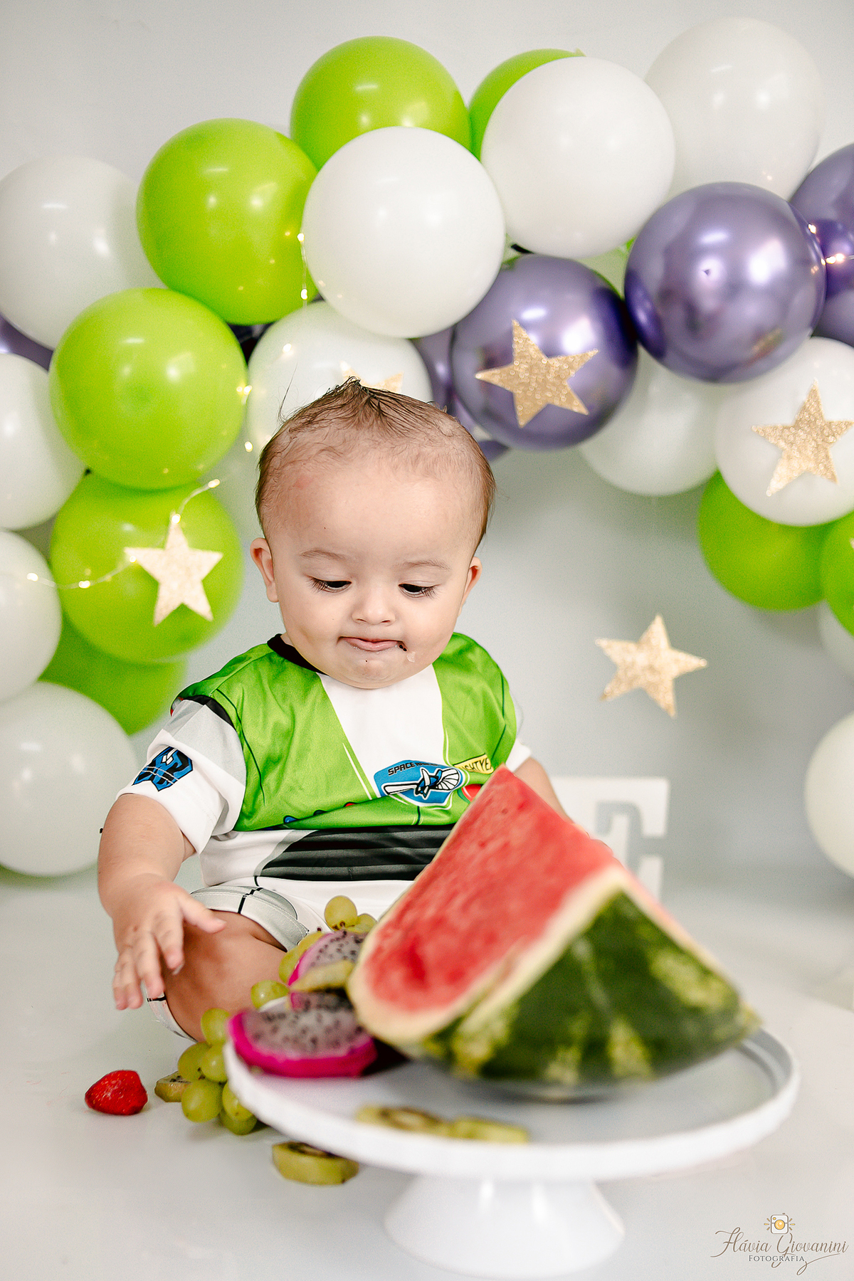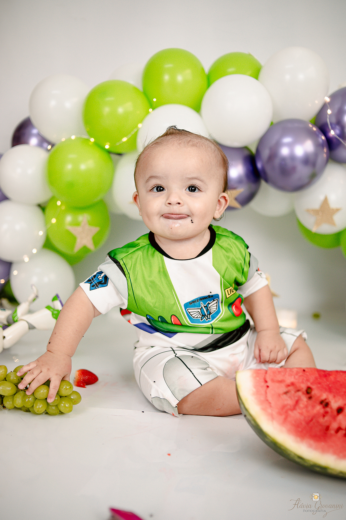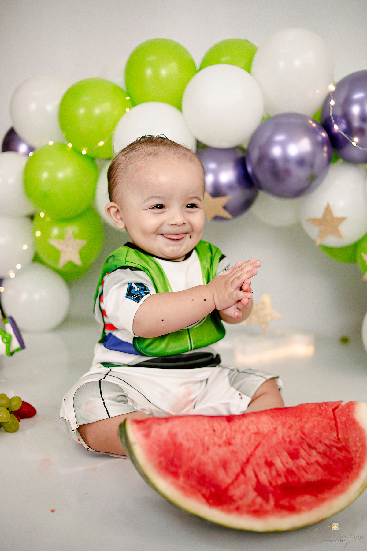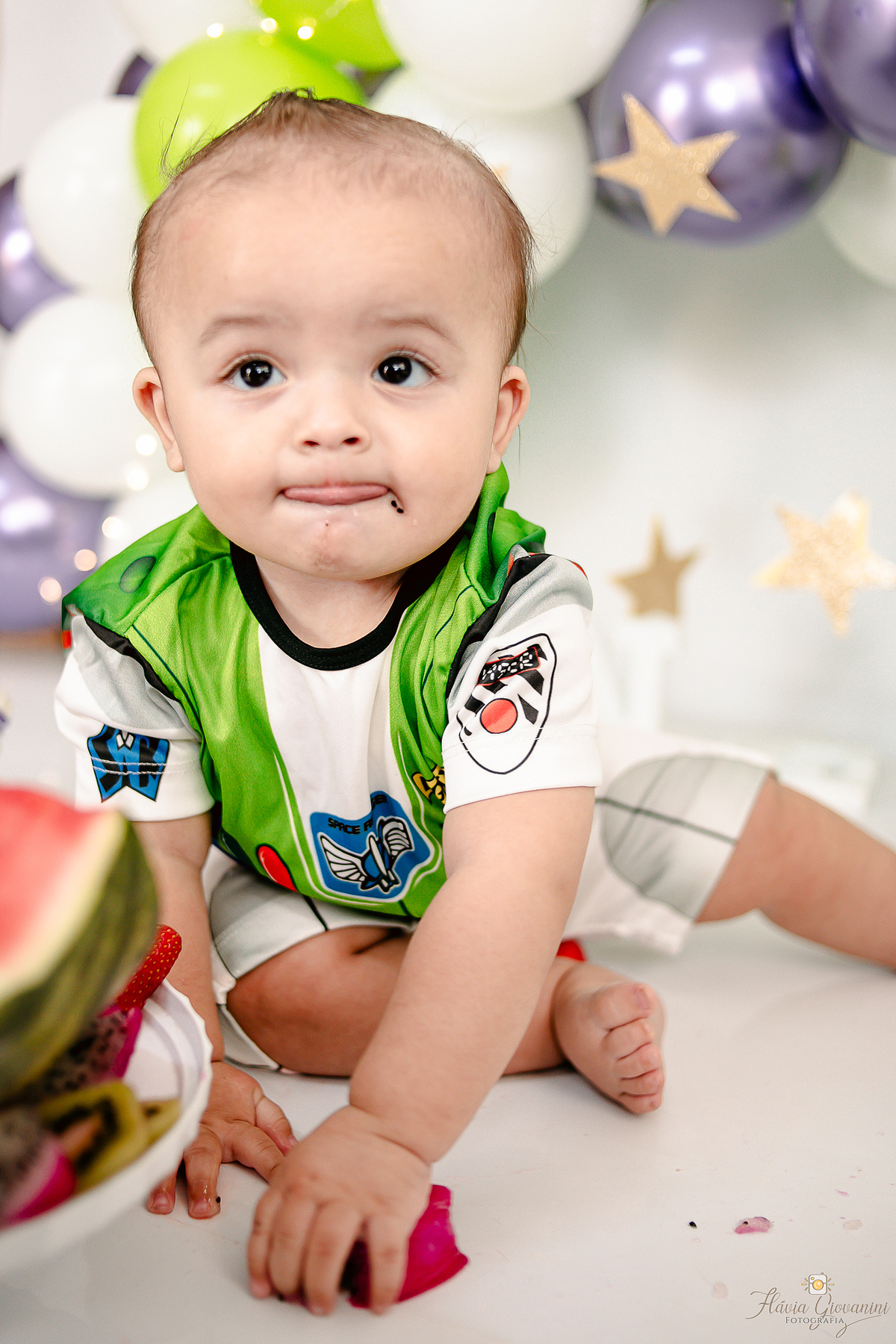 Consiste basicamente em deixar o bebê de fato esmagar o bolo/Fruta, se lambuzar e se divertir à vontade - Temos a opção de ensaio no estúdio e externo* - Começamos com fotos com os Pais e irmãos, passamos para o bebê sozinho no cenário e depois amassando o bolo. Por fim, um splash de presente para se refrescar e relaxar.